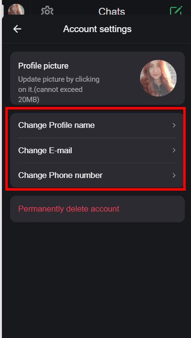 In this menu, you can review and modify your Account settings, including your profile name, picture, email, and phone number.