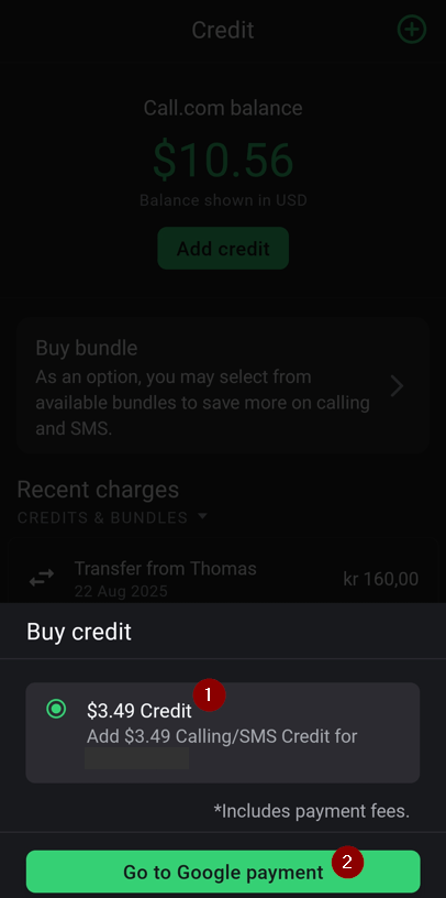You can purchase credits through your app or on our website, where you will always get the best deals. You need credits to make international calls and send SMS to mobile and landline numbers. Additionally, you can purchase and renew virtual numbers from your credits in the web version of the Call.com app. We offer in-app payments with Google Play or Apple Pay (depending on your device) for the mobile app, and direct card payments for the web app.