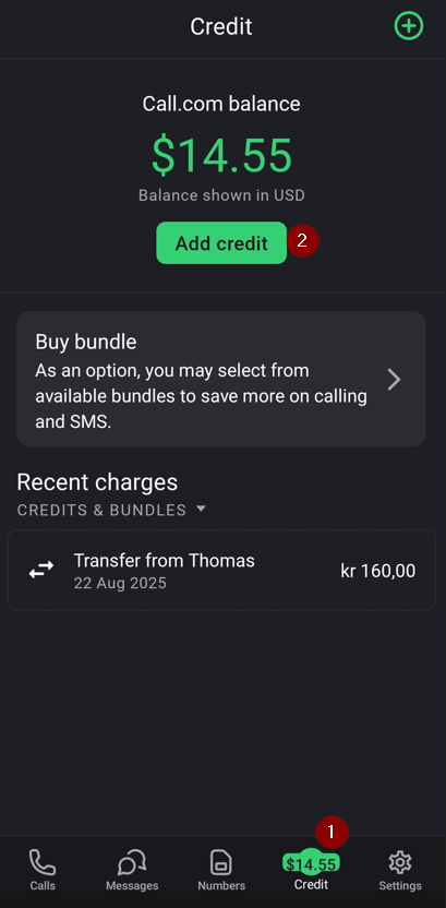 2.Click the “Credit” button on the bottom home screen and then the “Add credit” button