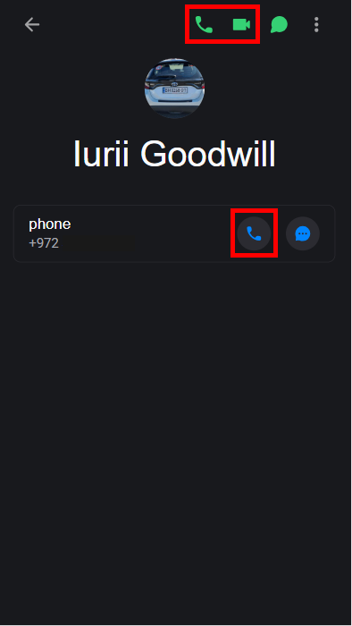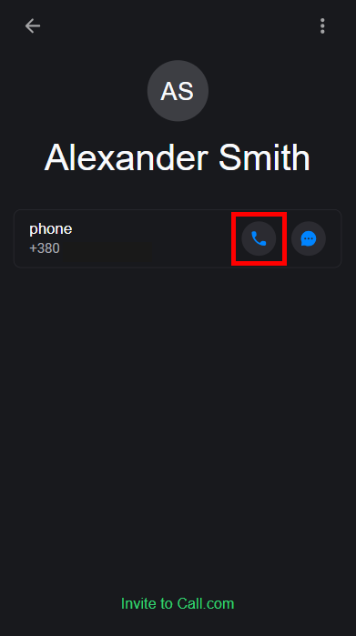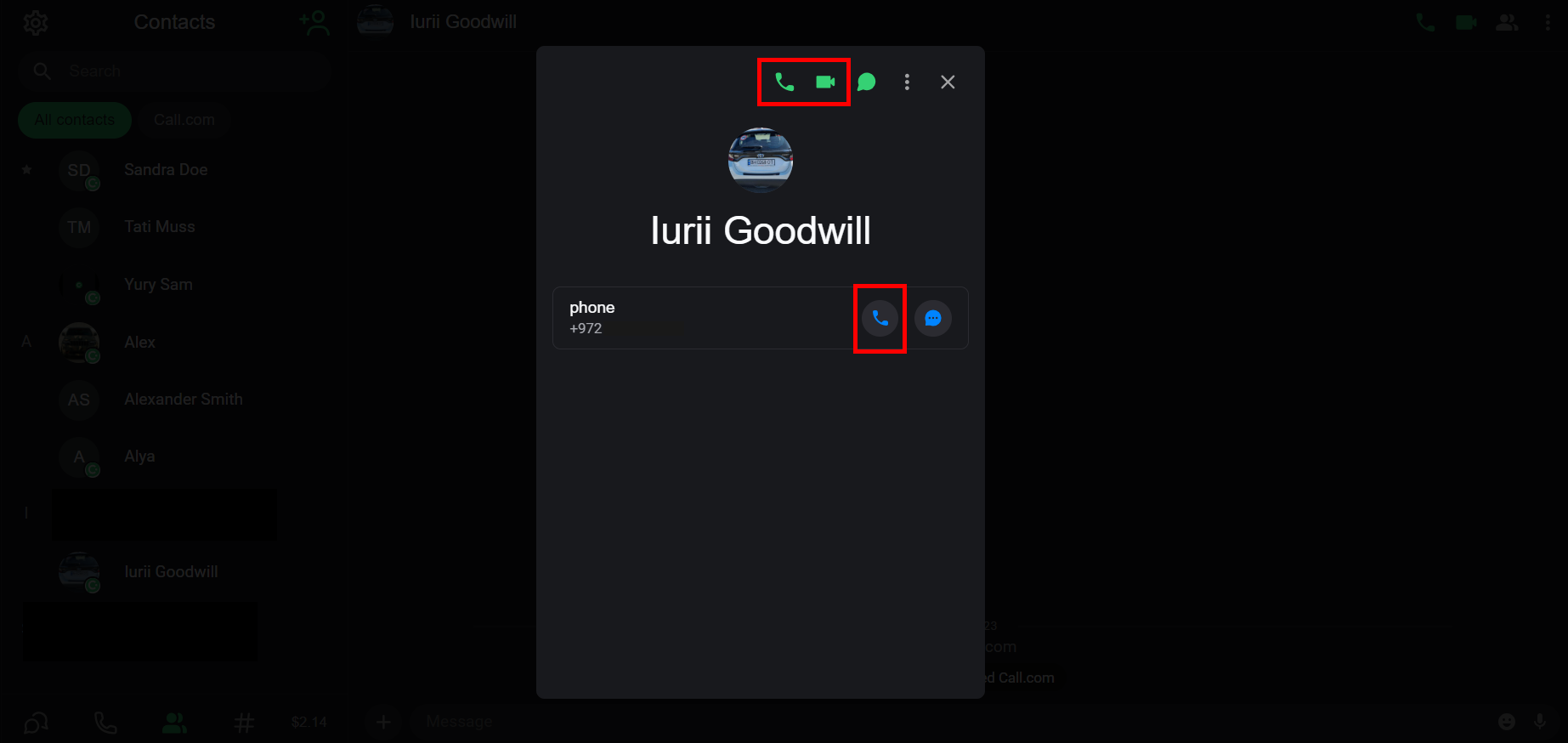 3. When calling a Call.com user, you have the choice to either start a free Call.com call or video call using the green buttons or make a regular call using the blue call button.