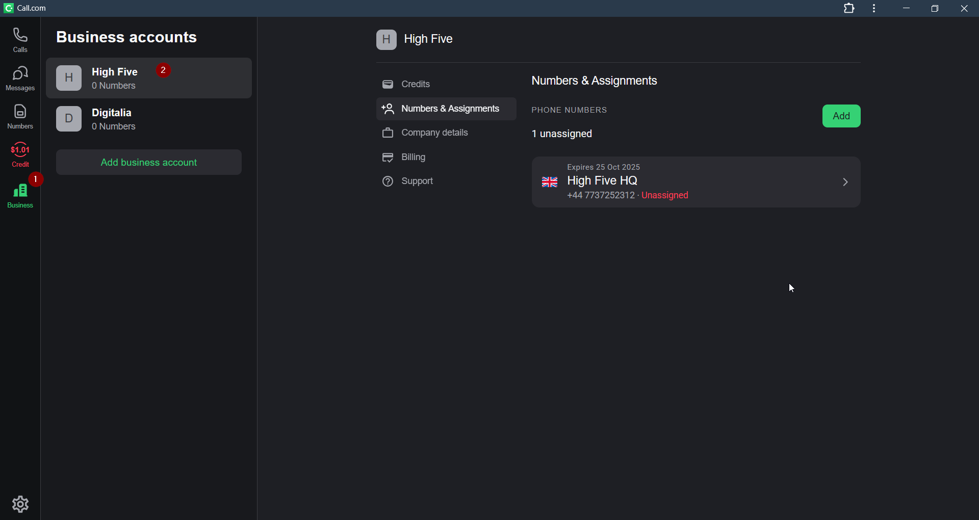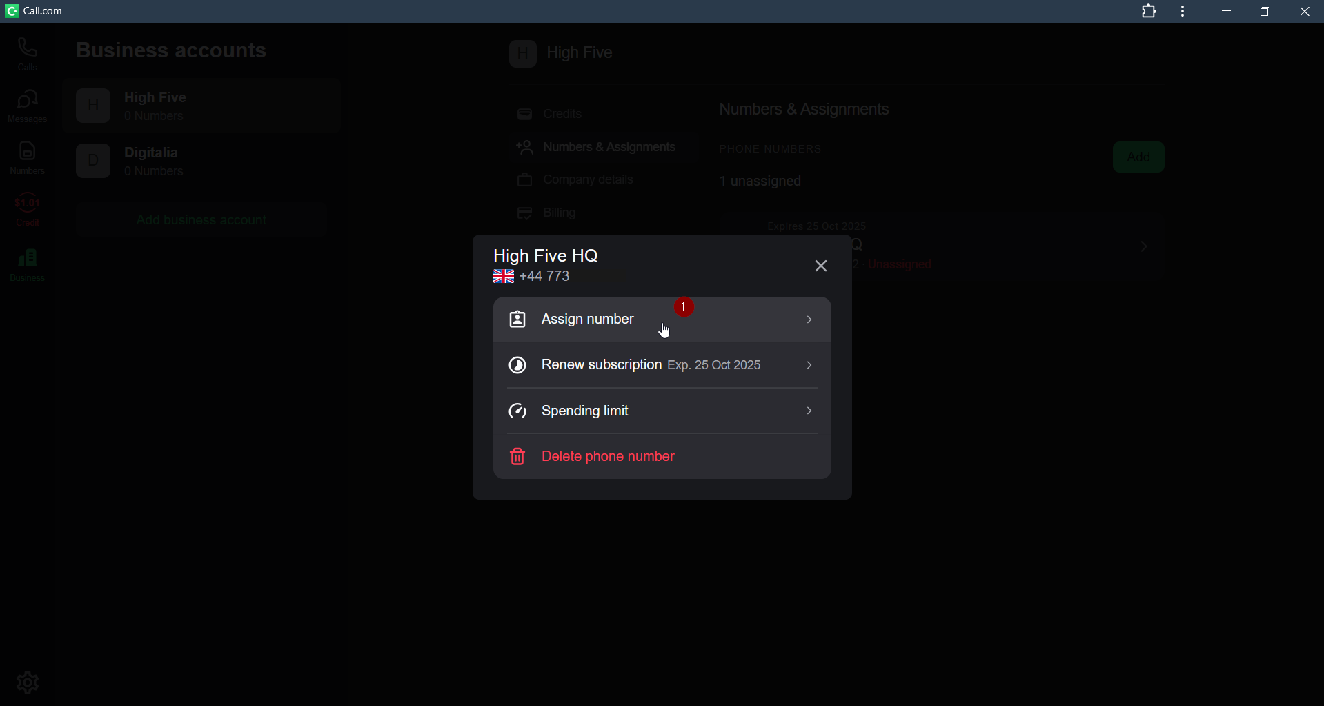 8.You will be then able to unassign the number if needed. To do so, select the number again -> Click the "Assign number" button -> Click the "Unassign number button"